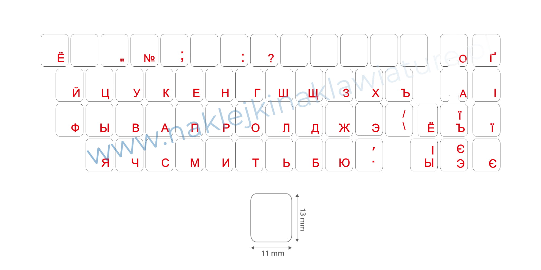 ROZMIAR pojedynczej naklejki na klawisz to 11 mm x 13 mm, rozmiar mniejszych przycisków to 11 mm x 6,5 mm.