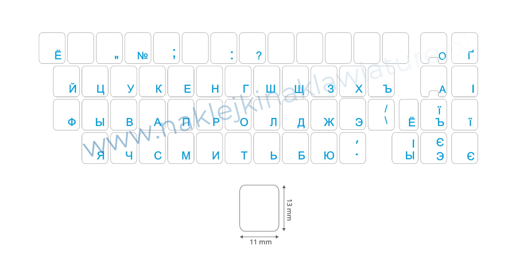 ROZMIAR pojedynczej naklejki na klawisz to 11 mm x 13 mm, rozmiar mniejszych przycisków to 11 mm x 6,5 mm.