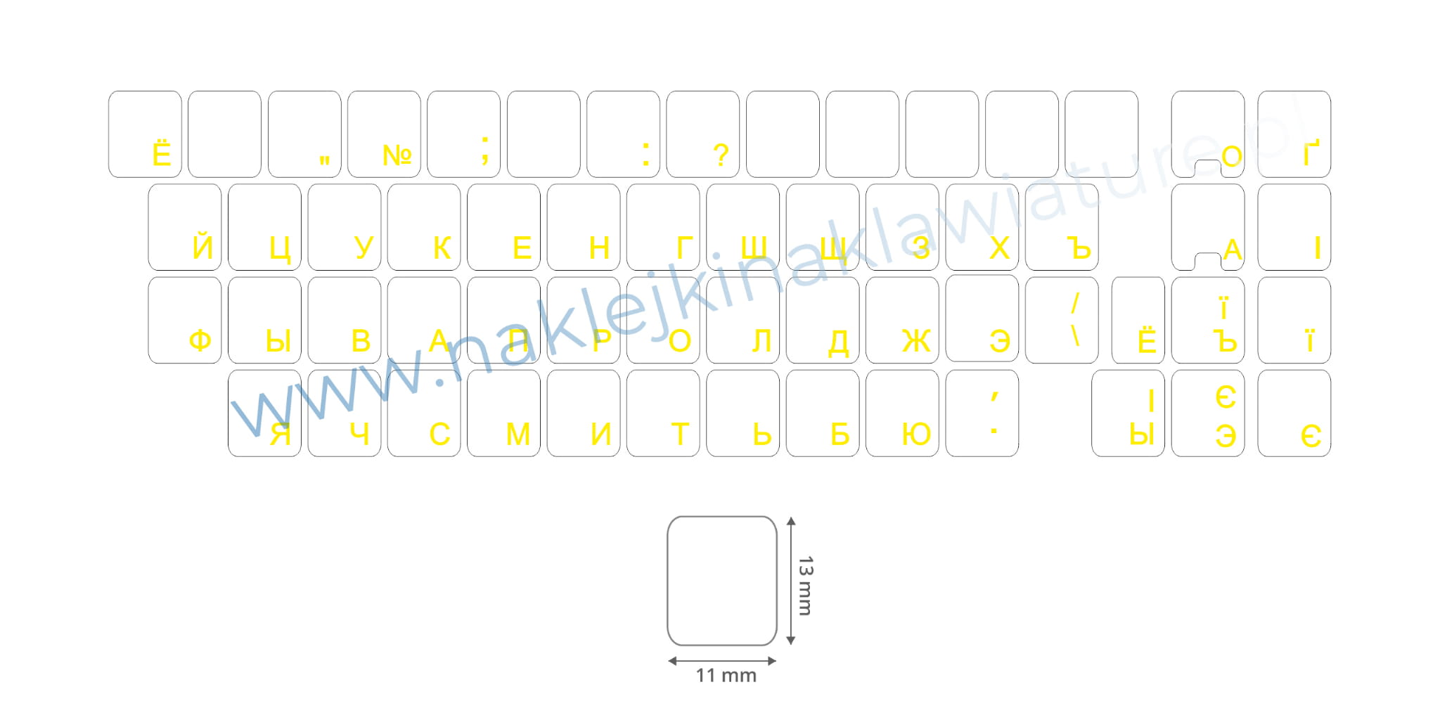 ROZMIAR pojedynczej naklejki na klawisz to 11 mm x 13 mm, rozmiar mniejszych przycisków to 11 mm x 6,5 mm.