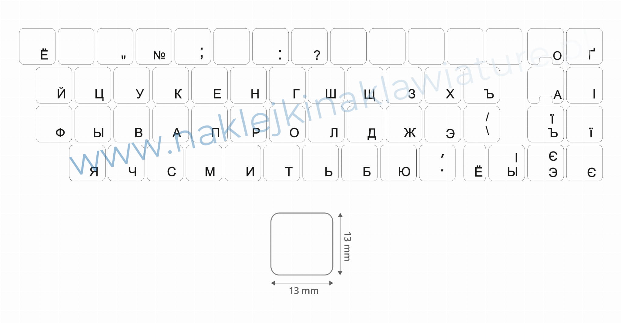 ROZMIAR pojedynczej naklejki na klawisz to 13 mm x 13 mm, rozmiar mniejszych przycisków to 13 mm x 6,5 mm.