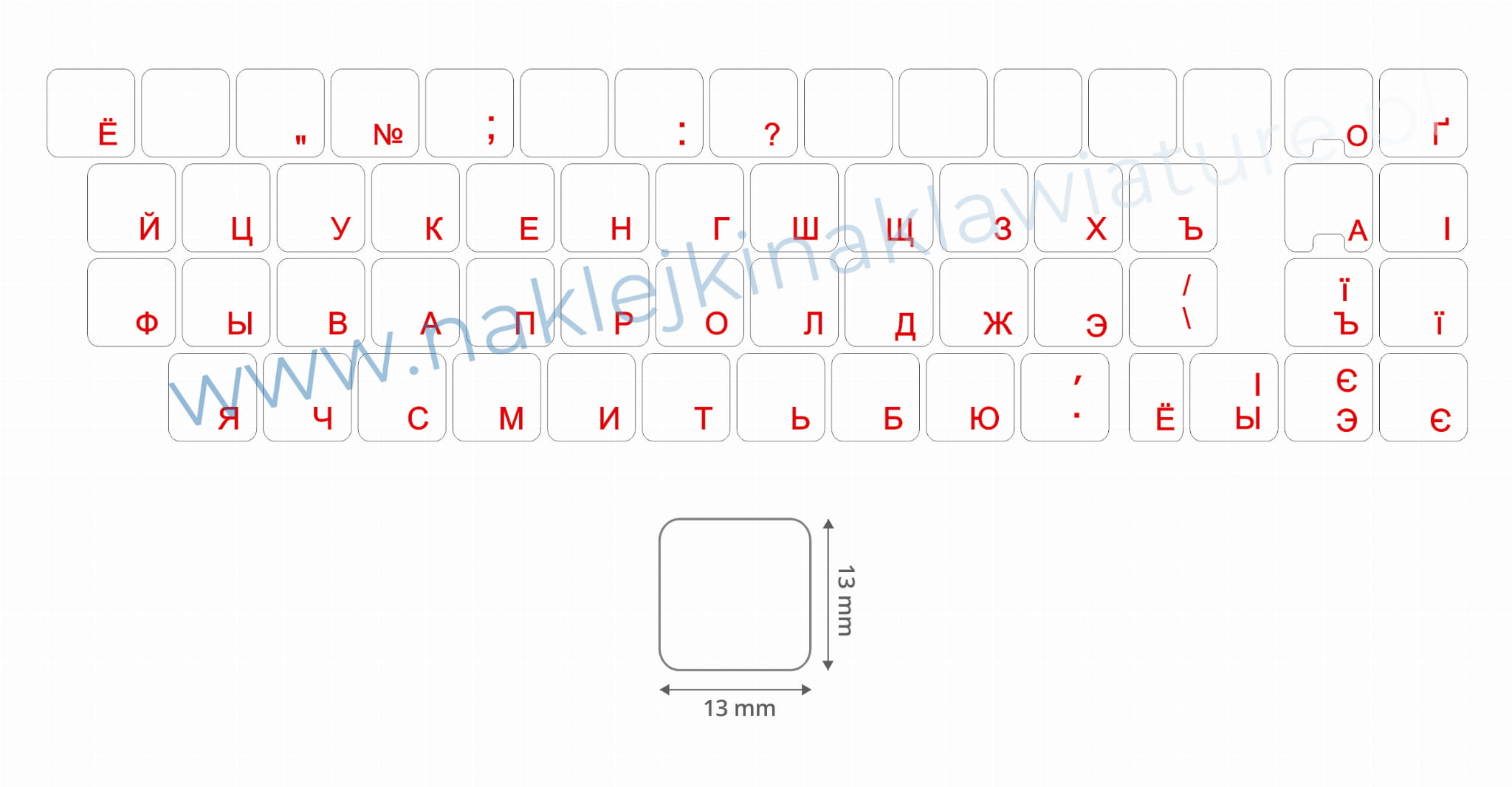 ROZMIAR pojedynczej naklejki na klawisz to 13 mm x 13 mm, rozmiar mniejszych przycisków to 13 mm x 6,5 mm.