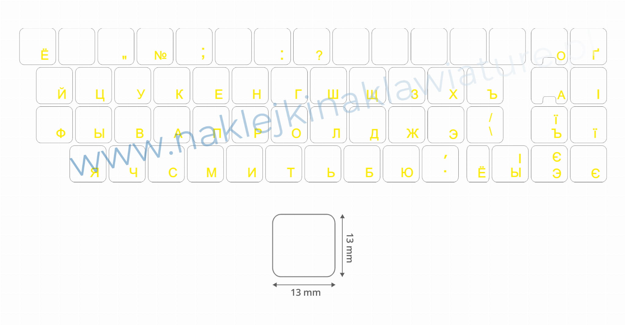 ROZMIAR pojedynczej naklejki na klawisz to 13 mm x 13 mm, rozmiar mniejszych przycisków to 13 mm x 6,5 mm.