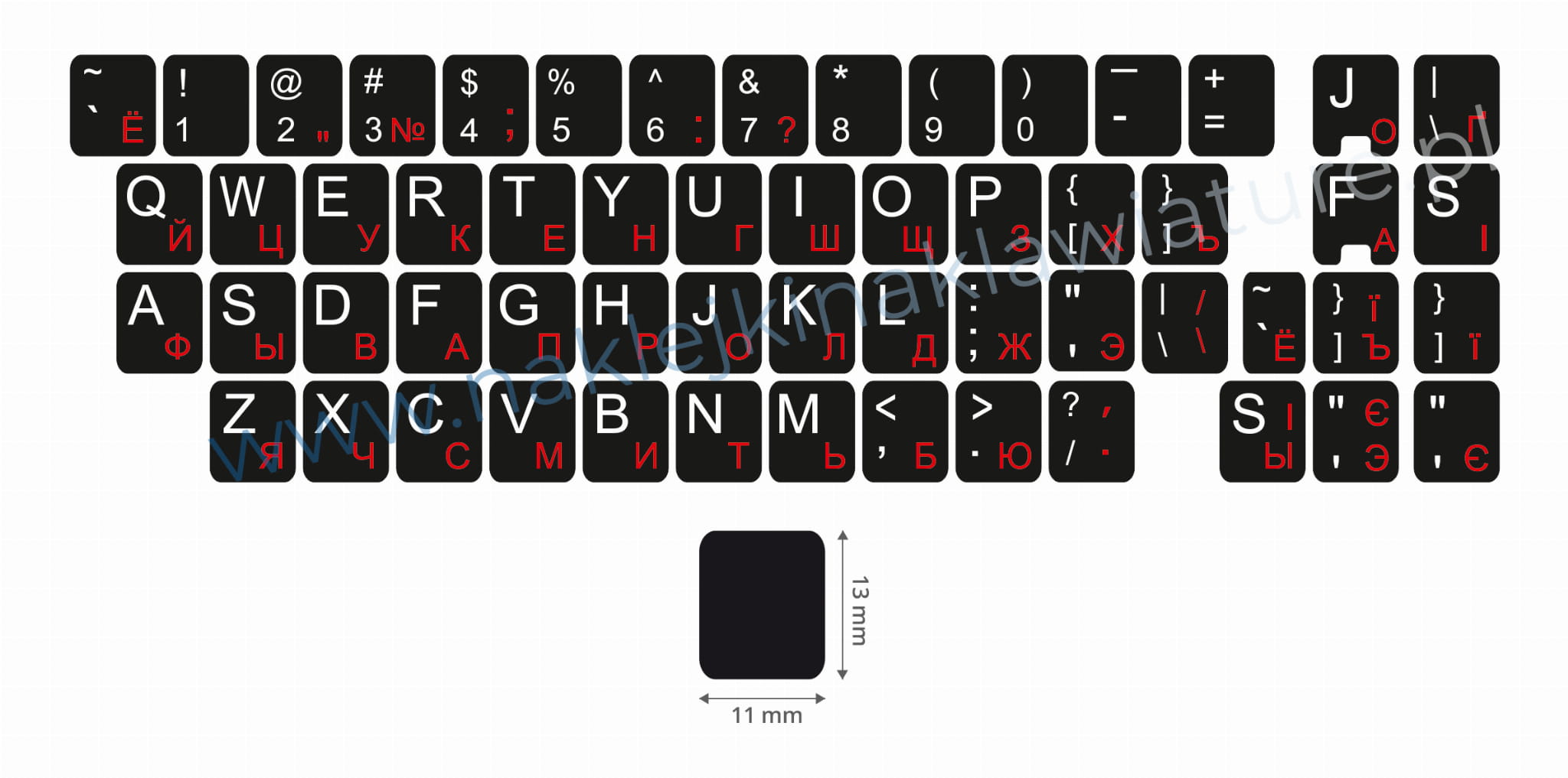ROZMIAR pojedynczej naklejki na klawisz to 11 mm x 13 mm, rozmiar mniejszych przycisków to 11 mm x 6,5 mm.
