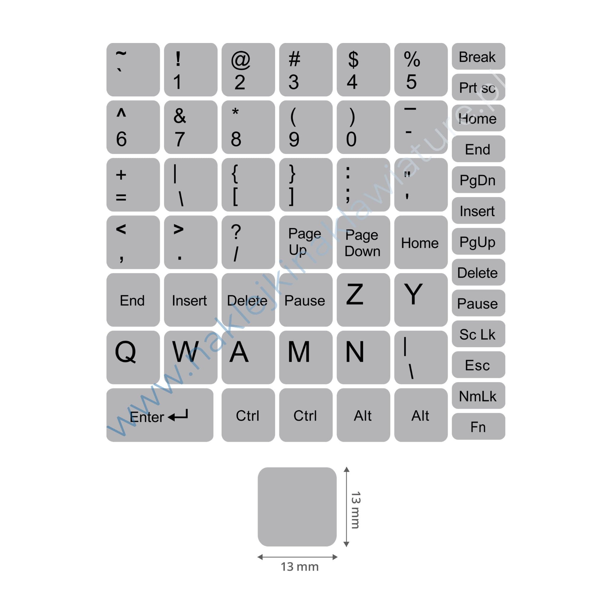 ROZMIAR pojedynczej naklejki na klawisz to 13 mm x 13 mm, rozmiar mniejszych przycisków to 13 mm x 6,5 mm.